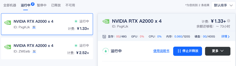 6)查看GPU使用情况: 租用界面点击详情按钮即可查看 GPU、CPU使用情况。