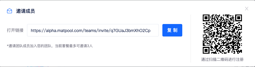团队创建者或管理员可点击复制 邀请链接,并将邀请链接发送给相关成员即可。